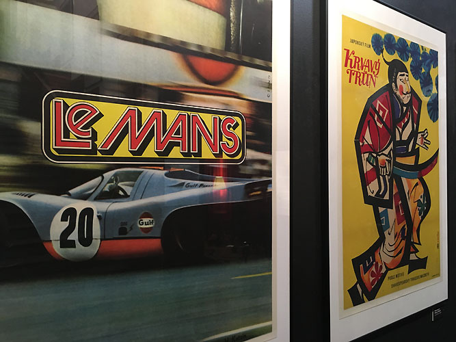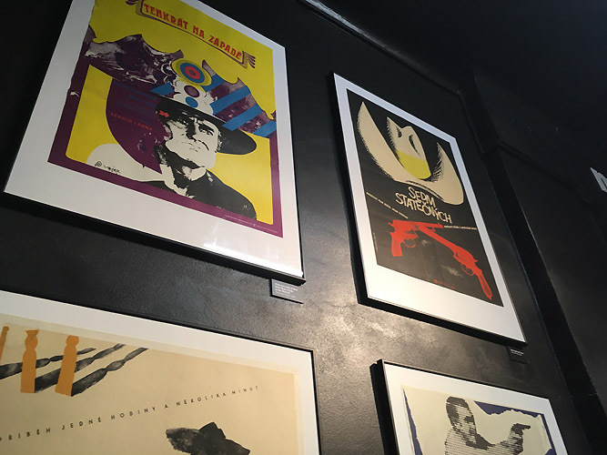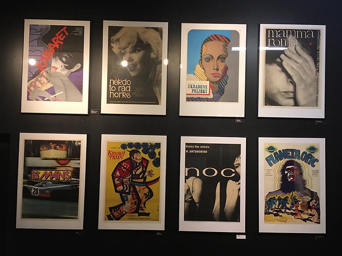 Jean-Paul Belmondo is the protagonist of four films having their posters displayed: The Man from Hong Kong, The Man from Acapulco from the more lighthearted part of his acting career. These are accompanied by posters for the groundbreaking films of Jean-Luc Godard, where J.P. Belmondo excelled – such as Breathless and Pierrot le Fou, both designed by Jiří Hilmar.